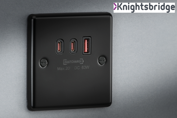 For residential use – and/ or where USB charging is required alongside ‘three pin power’ – Knightsbridge also offers two gang sockets which deliver up to 45W PD over a USB-C port and 18W QC over a USB-A port. Available in curved or square edge, the 45W sockets come in white, anthracite, matt black, matt white and brushed chrome.