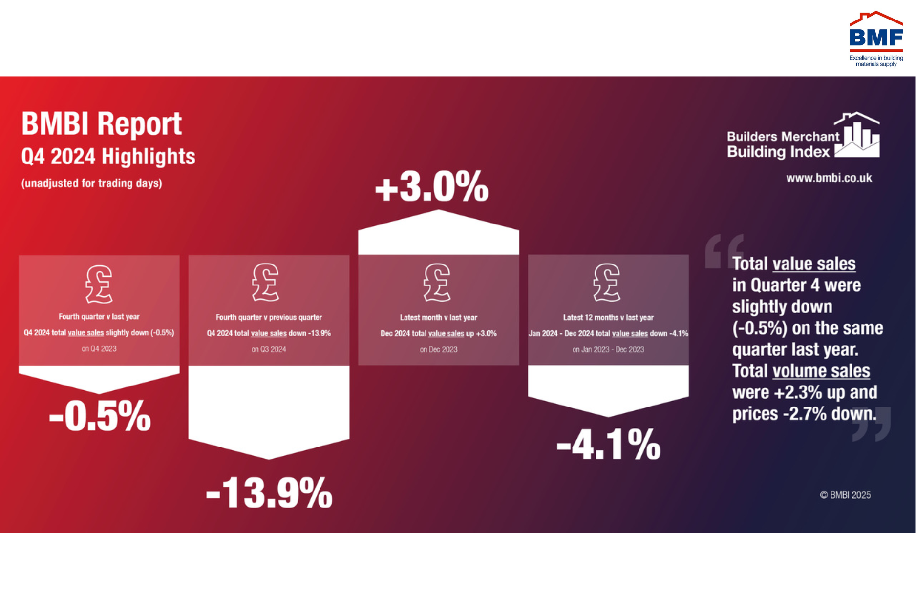 Despite a fall in total value sales during the final quarter of 2024, the figures released in the latest BMF Builders Merchants Building Index (BMBI) provide positive signals for the year ahead.