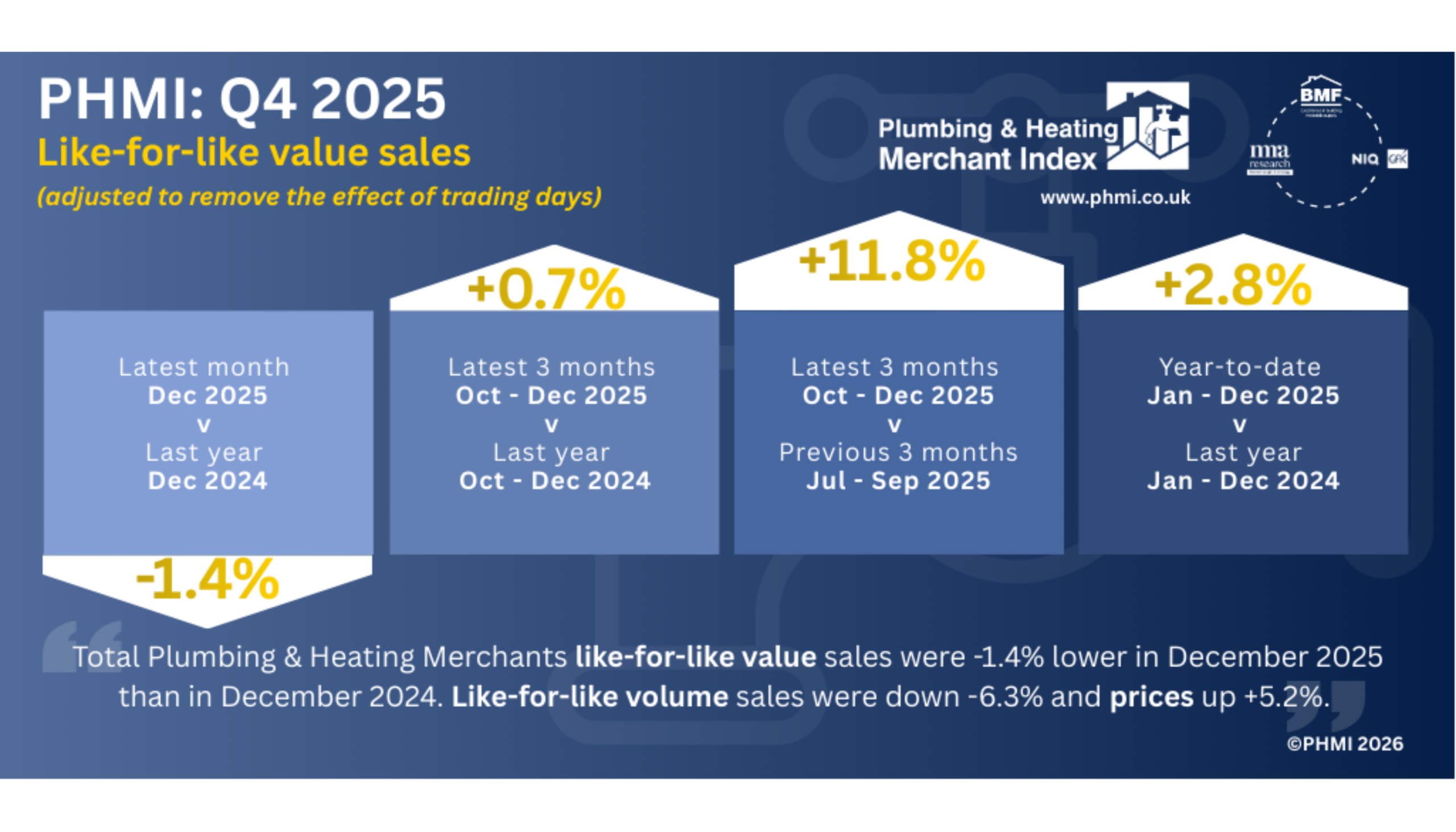 With four fewer trading days in Q4 2025, unadjusted value sales for the Total Plumbing & Heating Merchants market were +4.9% higher. Once again, this was the result of price increases (+8.6%), while sales volume was down at -3.4%.